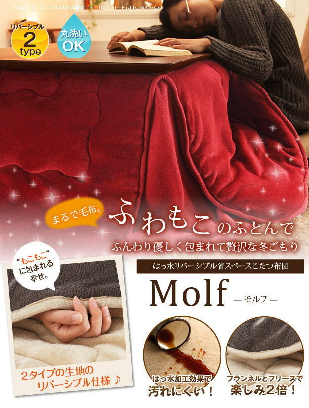 ウォッシャブルなので丸洗いもできるこたつ布団「Molf 正方形こたつ布団 75×75cm」。部屋やその日の気分や雰囲気に合わせて、リバーシブルを楽しんで頂くことができます。!サッと拭き取れて安心な撥水加工で、ずっとキレイなこたつ布団を実現してくれます。丸洗いが可能で洗濯できるから、いつも清潔に保つことができます。両面フランネル仕様なので、ずっと触っていたくなるようなどこに触れていても心地よいフワフワ感です。