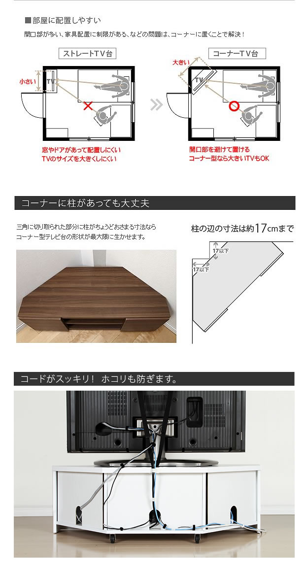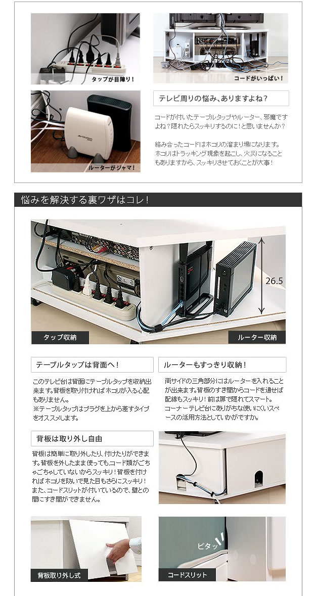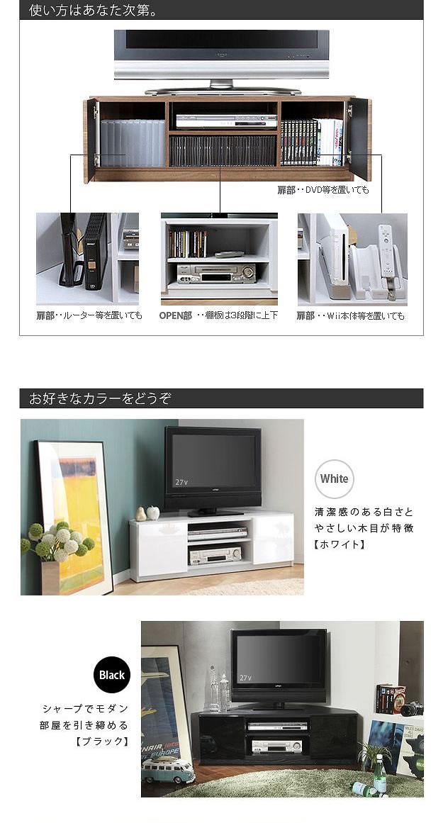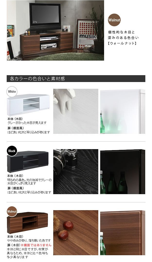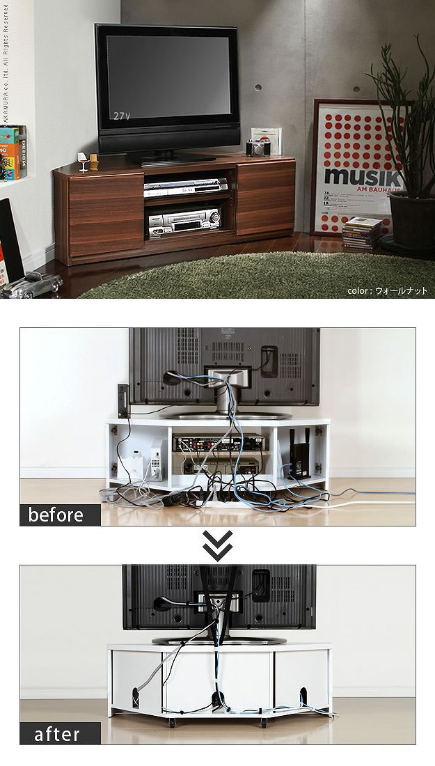 空間を有効活用出来て配線を綺麗に整理出来るコーナーテレビボード/色・タイプ:ホワイト&ウォールナット&ブラック コード収納 白 黒