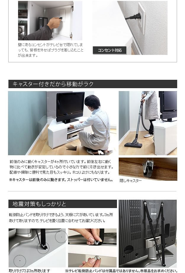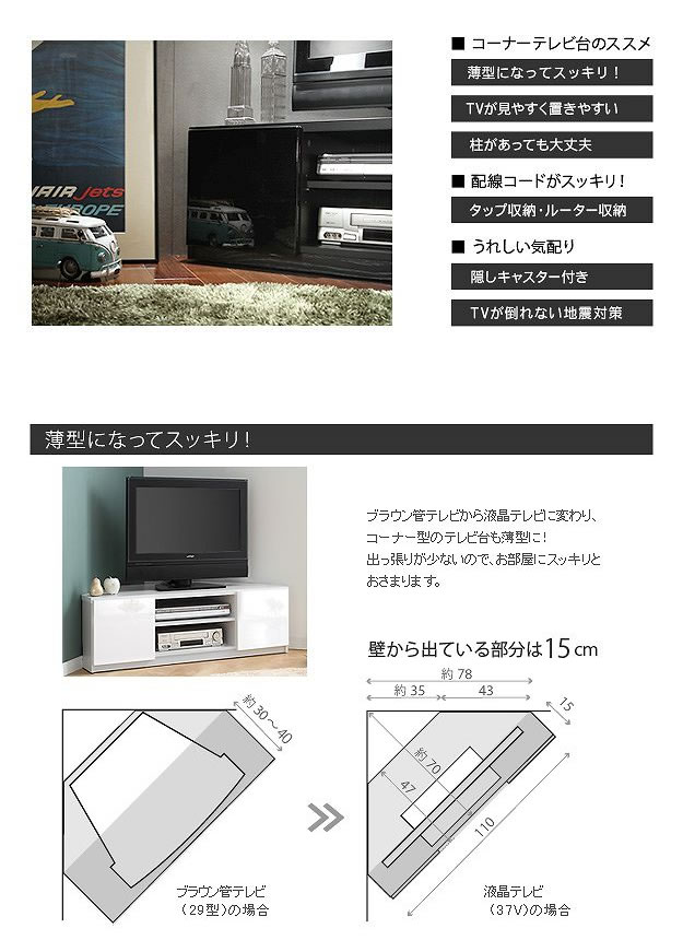 空間の隅に置きやすいコーナーテレビボード「Robin Corner TV board」。デッパリが少ないのでお部屋にスッキリと収まり、テーブルタップも背面へ収納できる仕様なのでデットスペースを無駄にしません。背面を取り付ければホコリが入る心配もなく、前後のみに動くキャスターが4か所ついています。配線やお掃除もしやすいので、ラクラク簡単な使い勝手です。ロータイプ設計で、コーナーに収められるので、圧迫感なくゆったりとしたリビングになります。