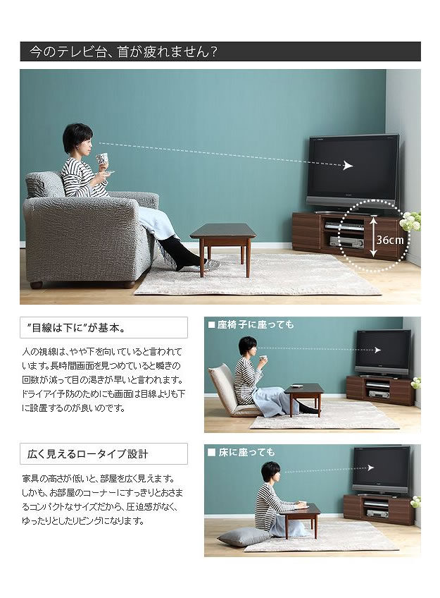 お部屋のどこに座ってもテレビが見やすくなるコーナーテレビ台。なかなか活用することが出来ないお部屋の角のスペースを無駄にすることなく有効に活用出来ます!また、キャスター付なので、移動も楽々行えます♪ロータイプのテレビボードなので、ソファに座っても床に座っても快適にテレビを観ることが出来ます!