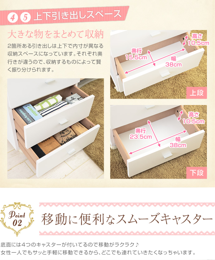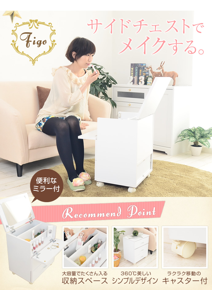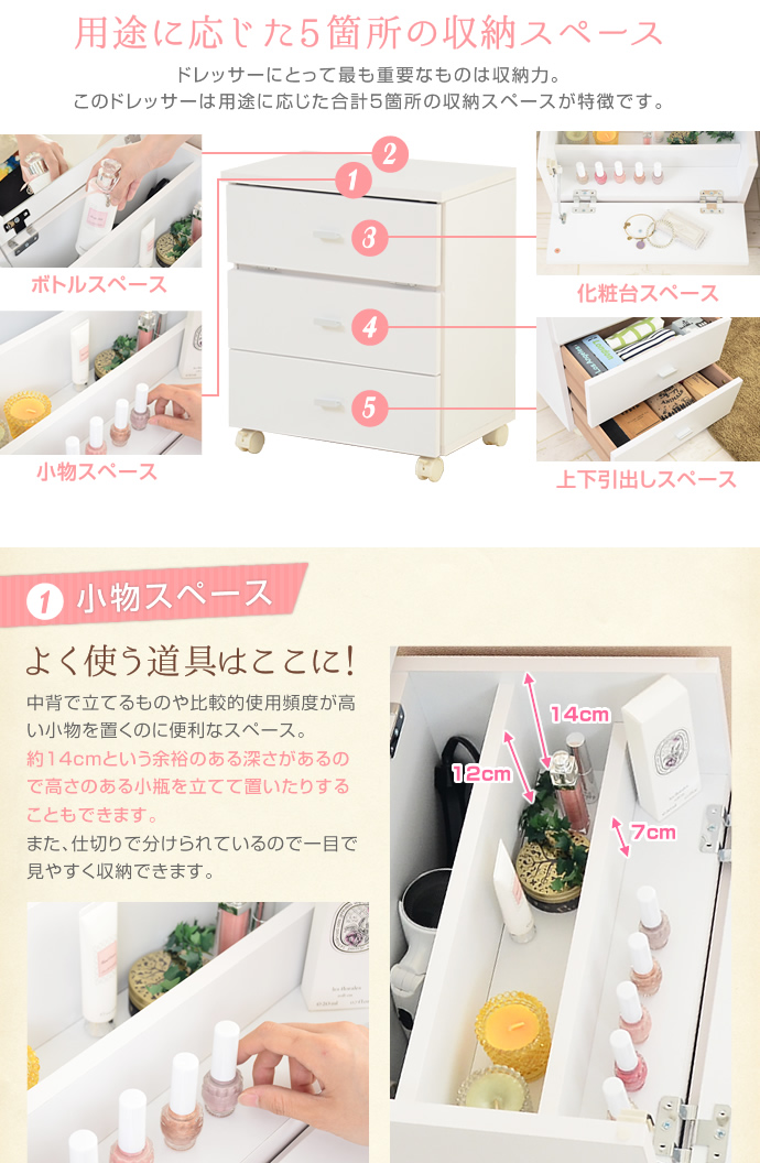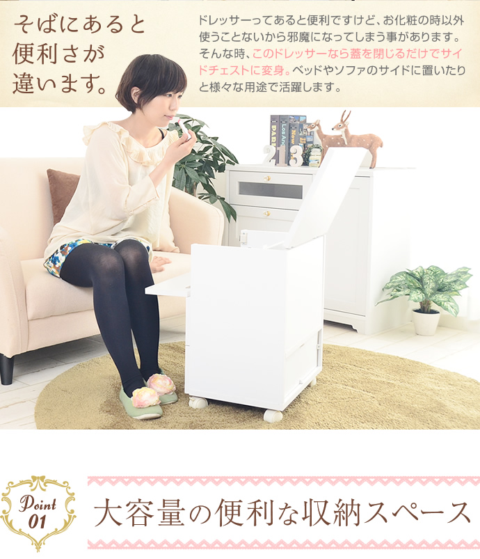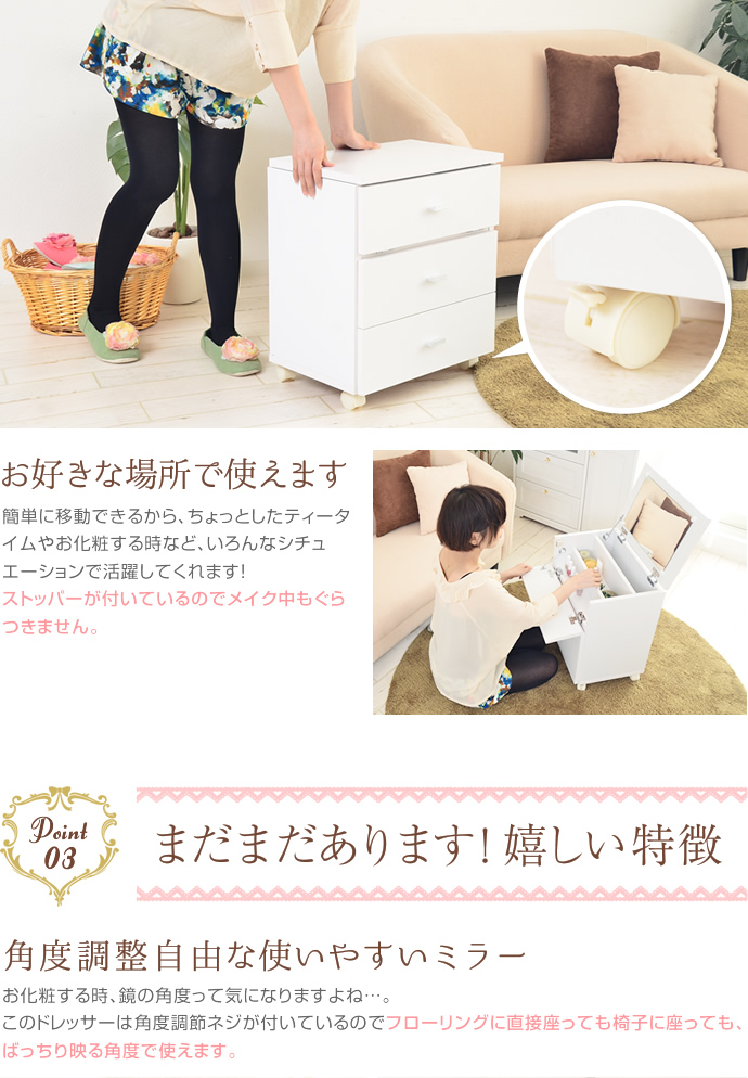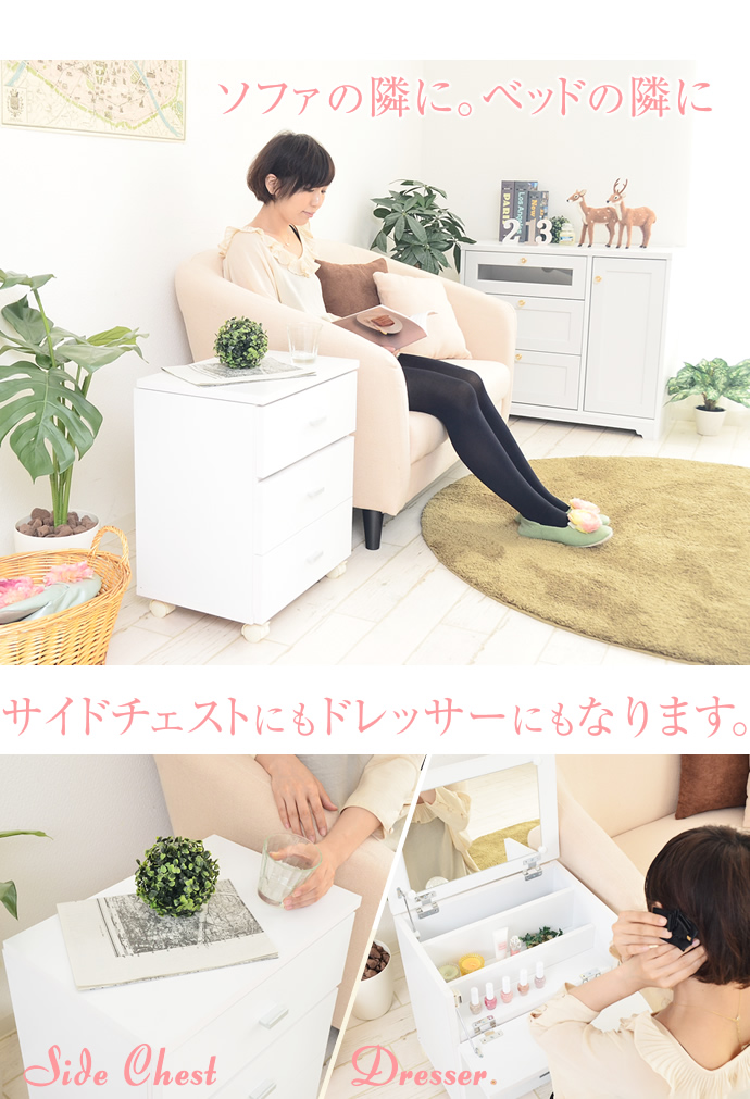 コンパクトなサイズながら大容量の収納スペースが付いているドレッサー。シンプルなデザインとホワイトのカラーが、可愛らしく、とてもオシャレです♪ドレッサーとして、お使いでないときはサイドチェストとしても、お使いいただけます!また、キャスター付なので移動も楽チンです!完成品でのお届けなので、すぐに使っていただけます。
