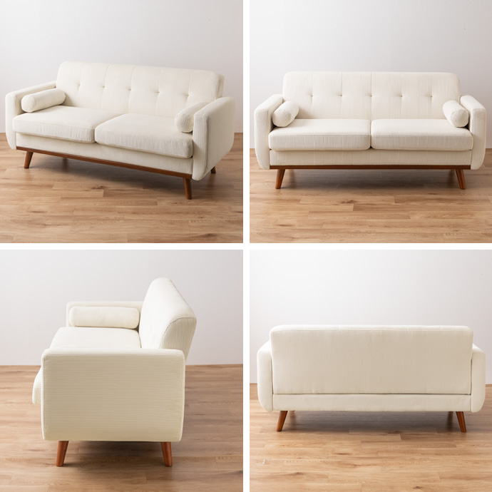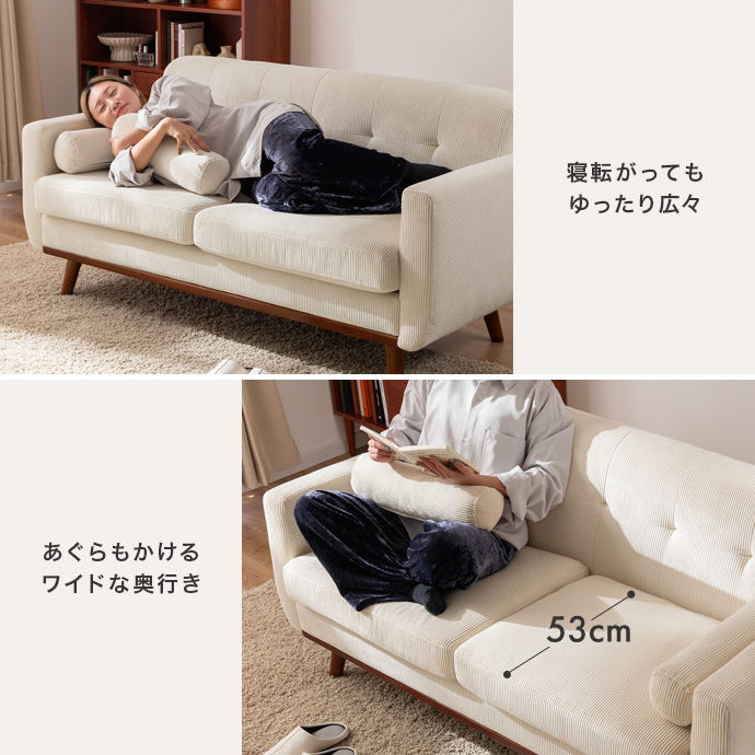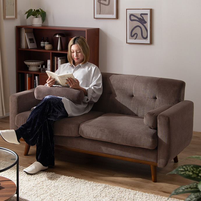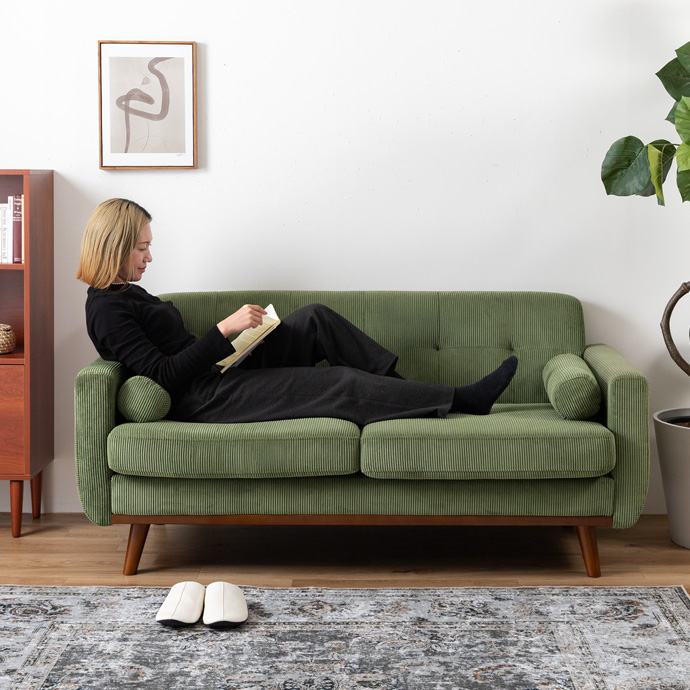 コーデュロイ生地と天然木フレームを組み合わせた、北欧ヴィンテージ風の2.5人掛けソファ。幅155cmとコンパクトながら、大人2人がゆったり座れる絶妙なサイズ感です。円柱形のクッションが2個付属しており、肘あてや枕としてくつろぎをサポートします。座面と付属クッションは、ご家庭で手軽に洗濯していただけるカバーリング仕様。美しいデザインと機能性を兼ね備えた、お部屋の主役となる一台です。