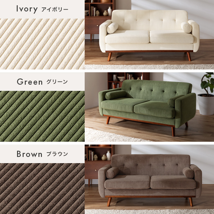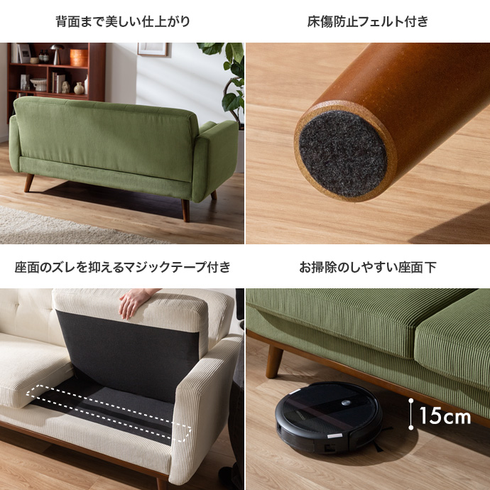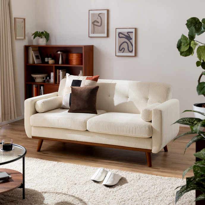 コーデュロイと天然木を組み合わせた、北欧ヴィンテージな雰囲気漂う2.5人掛けソファ。お部屋に置きやすい幅155cmながら、大人2人がゆったり座ることができ、付属クッションでくつろぎの幅も広がります。座面とクッションは洗えるカバーリング仕様で、日常に取り入れやすい一台です。