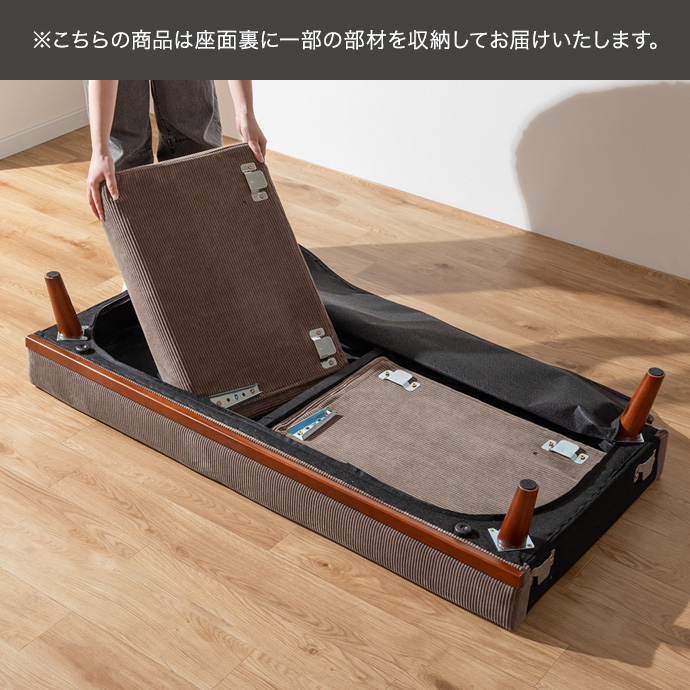 脚部は取り外しが可能。脚を外すことで気軽にローソファスタイルに変更いただけます。より床に近い状態で、リラックスして過ごしたい方におすすめです。また、ソファ底にはローソファ専用脚が付いているため、床が傷付く心配もありません。