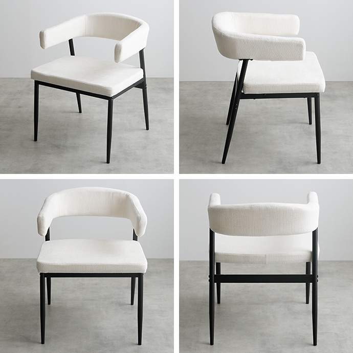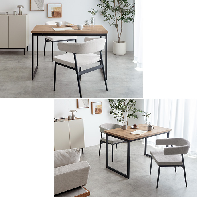 やわらかな風合いと美しい濃淡が魅力のファブリック生地。そこに、シャープなブラックアイアン脚を組み合わせました。異素材のコントラストが空間を引き締め、ダイニングをワンランク上の印象へと引き上げます。