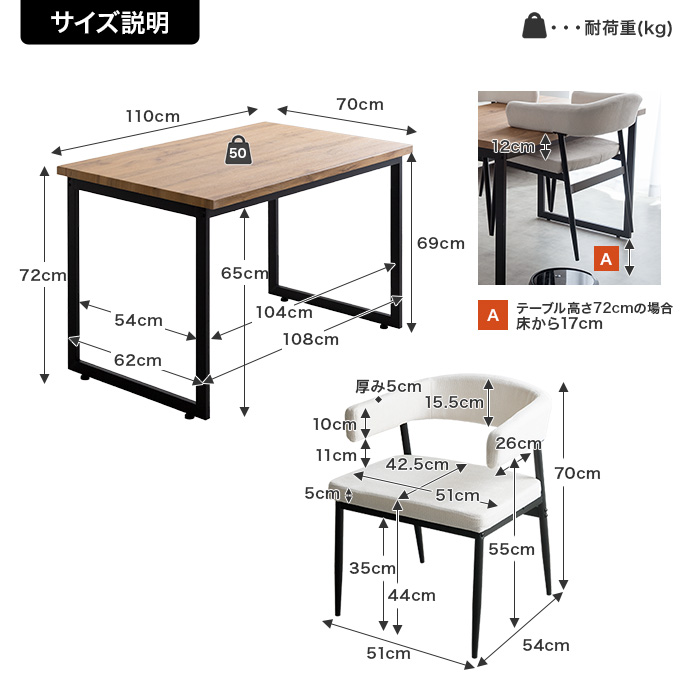 【耐荷重】テーブル:天板 約50kg、チェア:約100kg