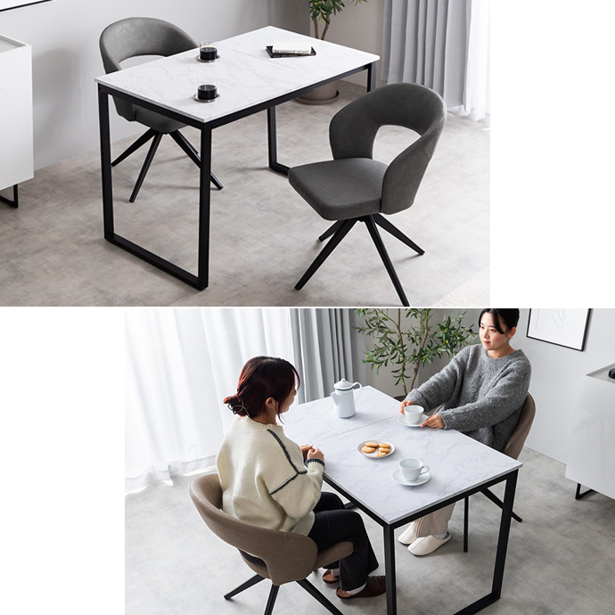 シーンに合わせて天板サイズを変えられる伸縮式テーブルと、360度回転チェアのダイニングセット。普段はコンパクトに、来客時にはワイドに広げて使用可能です。座ったまま向きを変えられる回転チェアで立ち座りもしやすく、日常の動作をスムーズに行えます。