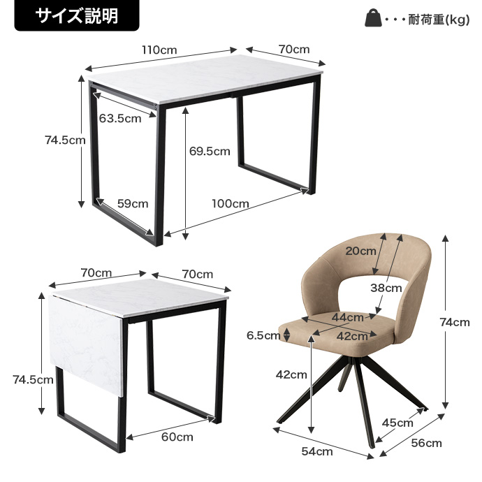 【テーブル】幅70~110cm×奥行70cm×高さ74.5cm 【チェア】幅54cm×奥行56cm×高さ74cm(座面高:42cm) |