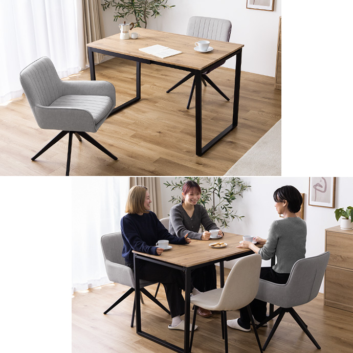シーンに合わせて天板サイズを変えられる伸縮式テーブルと、360度回転チェアのダイニングセット。普段はコンパクトに、来客時にはワイドに広げて使用可能です。座ったまま向きを変えられる回転チェアで立ち座りもしやすく、日常の動作をスムーズに行えます。