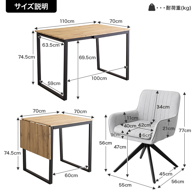 【テーブル】幅70~110cm×奥行70cm×高さ74.5cm 【チェア】幅55cm×奥行56cm×高さ77cm(座面高:47cm) |
