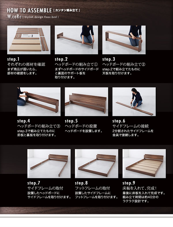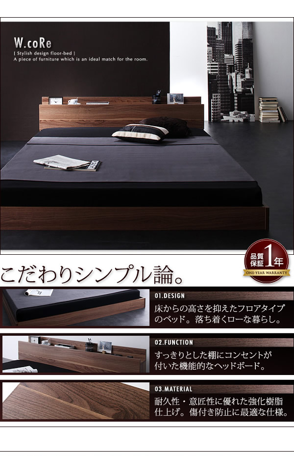 【シングル】 W.coRe フロアベッド ロータイプ 棚付 コンセント付 幅105cm