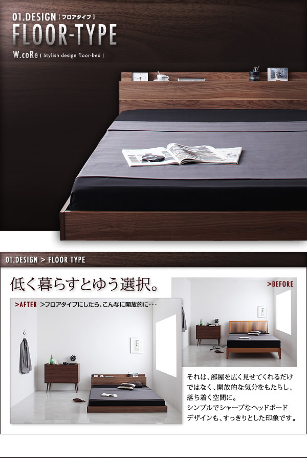 • 【シングル】 W.coRe フロアベッド ロータイプ 棚付 コンセント付 幅105cm
