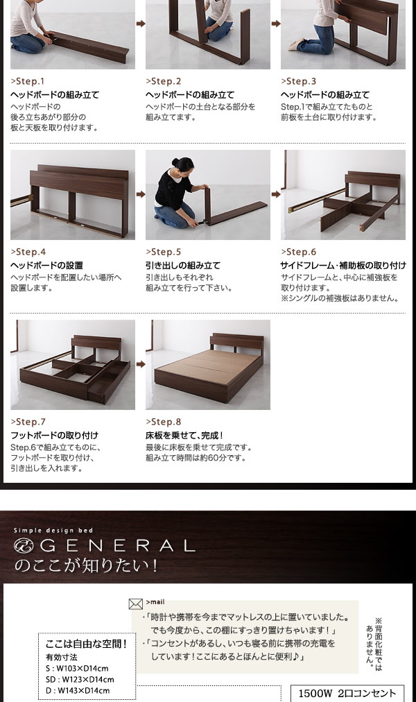 • 【ダブル】 General 引出し・コンセント付きベッド 幅143cm