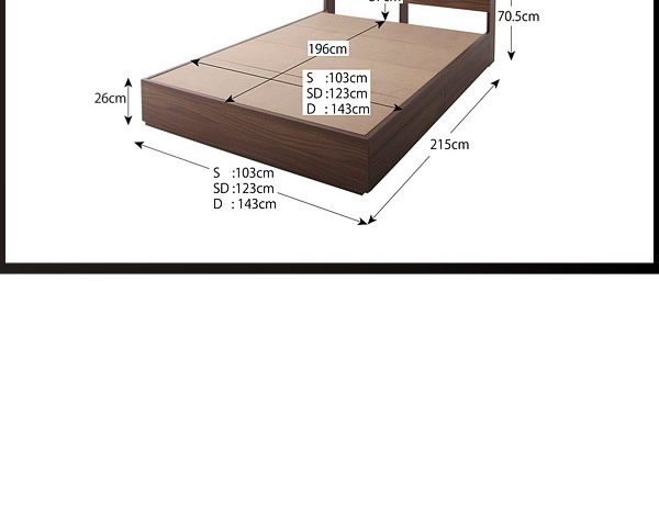 二杯付きの収納とコンセント穴が2つ付いたベッド。大きさはシングルサイズと一人で寝るにはちょうど良いサイズ。収納はベッド下にあり、衣類や雑誌などを置ける二杯付き収納。またヘッドボードも本、小物、リモコンなども置けるスペース。ヘッドボードにはコンセント穴が2口ついているのでスマホの充電など便利な機能付き。和室でも洋室でも自由に置けるシンプルテイストで、シックでお洒落なウォールナット柄のデザインで落ち着きのある空間へ。