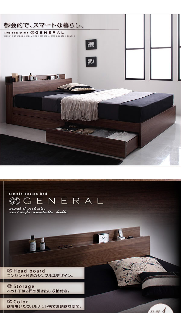 【シングル】 General 引出し・コンセント付きベッド 幅103cm