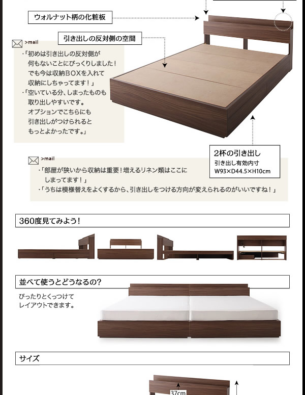 二杯付きの収納とコンセント穴が2つ付いたベッド。大きさはダブルサイズと二人で寝るにはちょうど良いサイズ。収納はベッド下にあり、衣類や雑誌などを置ける二杯付き収納。またヘッドボードも本、小物、リモコンなども置けるスペース。ヘッドボードにはコンセント穴が2口ついているのでスマホの充電など便利な機能付き。和室でも洋室でも自由に置けるシンプルテイストで、シックでお洒落なウォールナット柄のデザインで落ち着きのある空間へ。