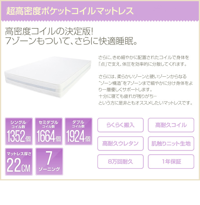 【超高密度ハイグレードポケットコイルマットレス】幅:140cm×奥行:約195cm×高さ:22cm(コイル数:1924)