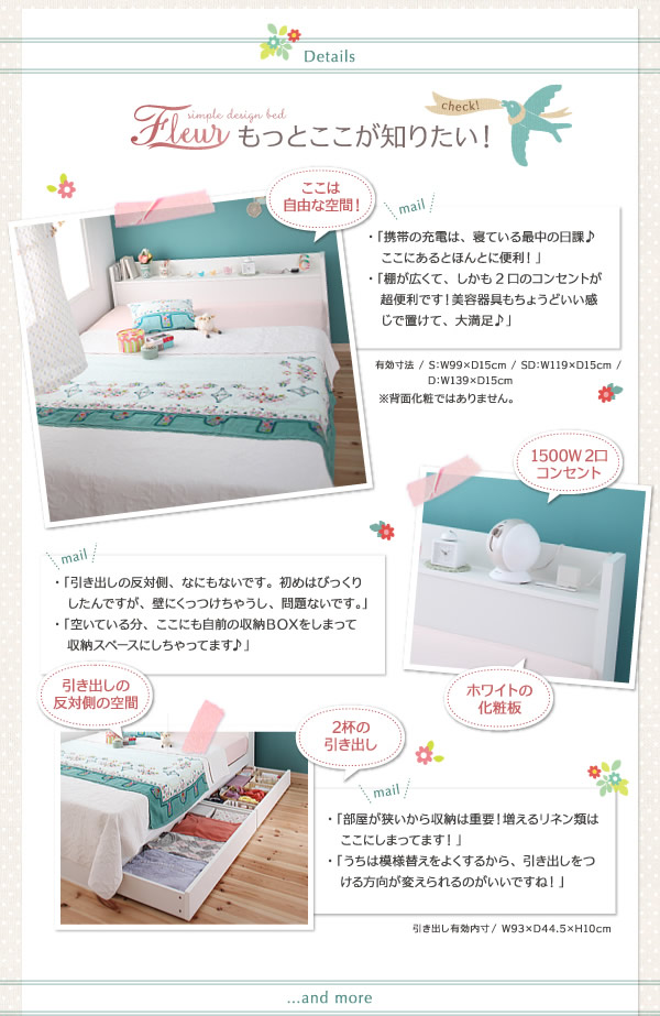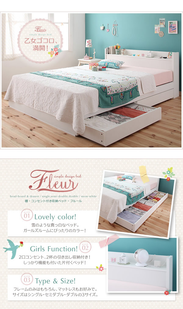 【シングル】 Fleur 引出し・コンセント付きベッド 幅103cm