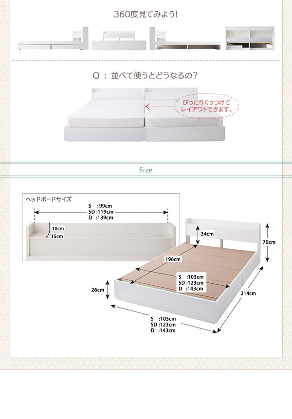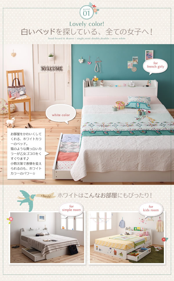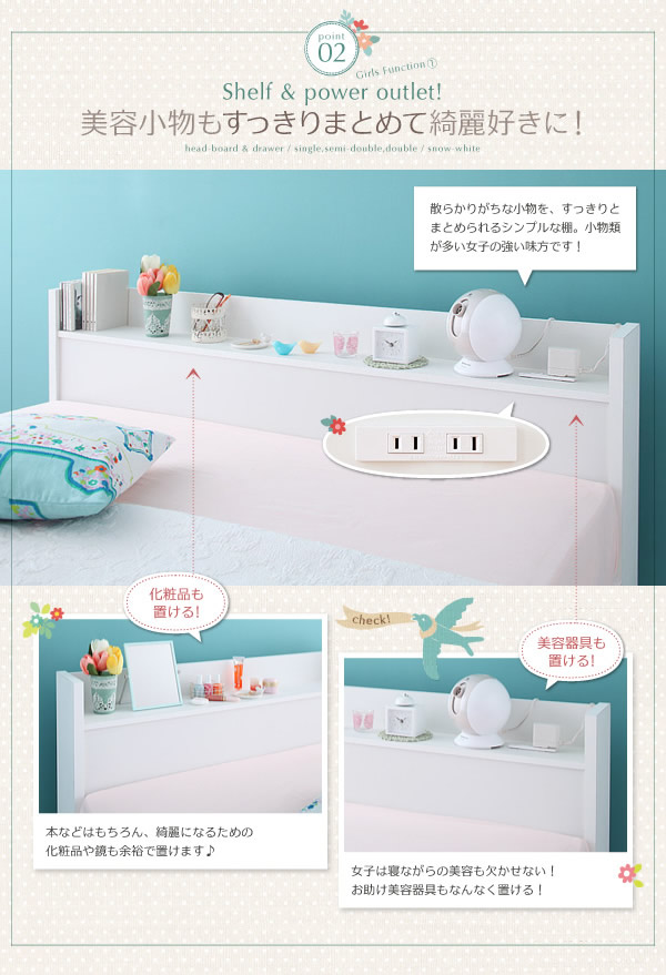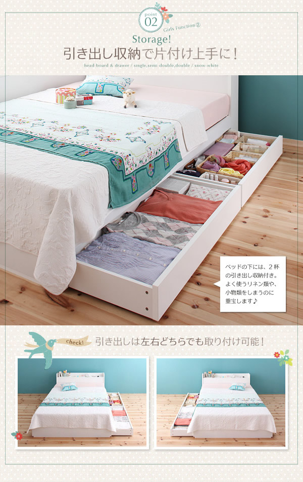 女性にピッタリなデザインと機能を兼ね備えた収納付ベッド。清潔感があり、お部屋を可愛く演出してくれそうなデザインとなっております!ヘッド部分には、コンセントが2口と小物や美顔器を置くことが出来るスペースが付いております。また、ベッド下は引出し収納となっており、ベッド下のスペースも有効活用しております。引出しは、お部屋に合わせてベッドの左右どちらでも取り付けていただけます♪