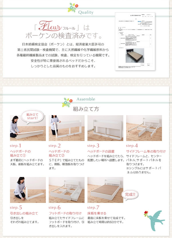 | 商品名 | 【シングル】 Fleur 引出し・コンセント付きベッド 幅103cm |