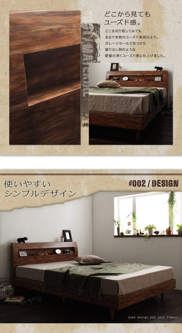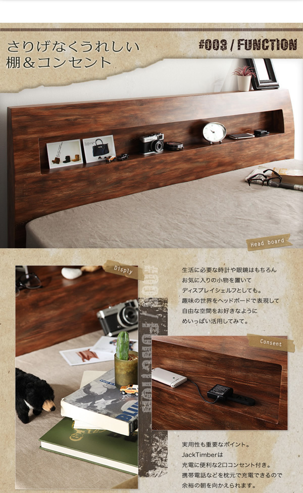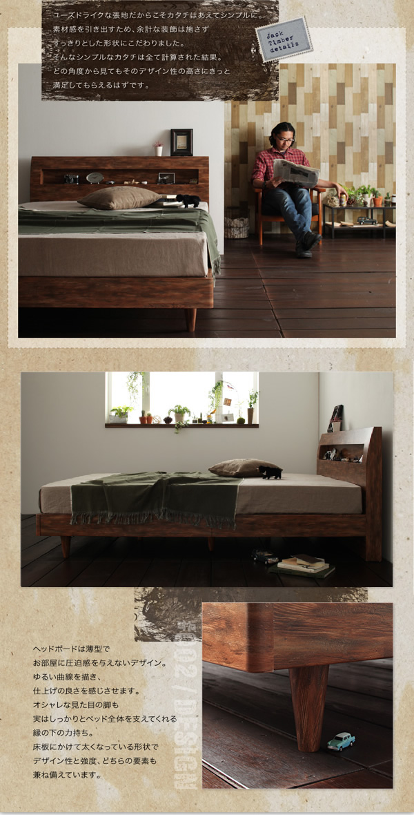 独特の色合いがあるデザインでお部屋の空間をおしゃれに演出してくれ、まるで長年使い続けていたかのような味のある風合いのヴィンテージテイストのすのこベッド「Jack timber」。アメリカンヴィンテージスタイルのお部屋にも取り入れやすい。ヘッドボードには小物を置ける収納スペースがあり、時計やメガネなど収納できます。コンセントが付いているので携帯なども充電できる!大きさはシングルサイズと一人で寝るにはちょうど良いサイズ。