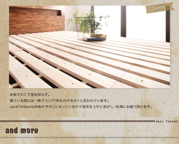 まるで、ずっと使い続けてきたかのような風合いのあるデザインのすのこベッド。寝室を暖かく落ち着く空間に演出してくれそうです!ヘッド部分には、コンセントと収納スペースがついており、寝ている間に携帯の充電が出来たり、目覚まし時計や小物を置くことが出来ます!すのこベッドは、通気性に優れておりオールシーズン快適にお使いいただけます!