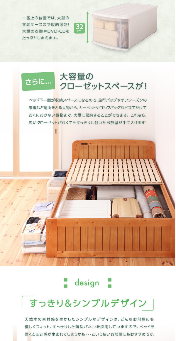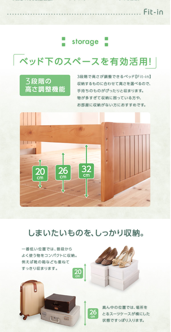 収納するものに合わせて3段階で高さを調節することが出来るすのこベッド。20cm・26cm・32cmの3段階で調節出来ます。また、ベッド下一面が収納スペースになるので、カーペットやゴルフバックを収納することも可能!天然木パイン材を使用したシンプルなデザインで、お部屋を優しく落ち着く空間に演出してくれます!ヘッド部分には、2口コンセントが付いているので携帯を充電したり、ヘッドライトを置くことも出来ます。