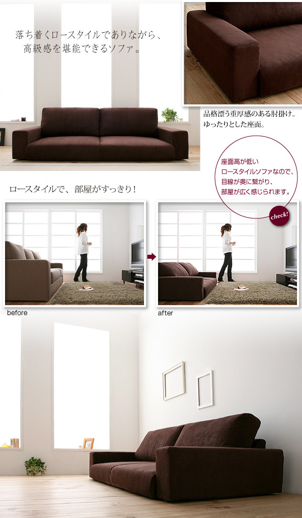 お部屋に圧迫感を与えず、広く見せることが出来る2.5人掛けフロアソファ。フロアソファは、座面が低いので小さなお子様がいらっしゃるご家庭でも安心してお使いいただけます。座面の奥行は、約55cmとなっておりますので、ゆったりと快適におくつろぎいただけます!また、背もたれの角度は自由にお好みの角度に変えることが出来ます。