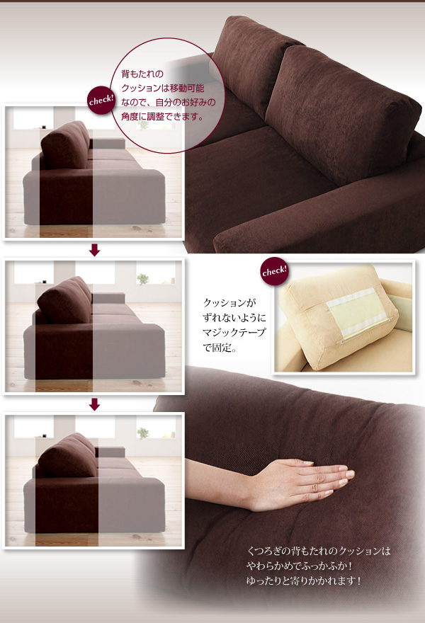 シンプルで使いやすいデザインなので北欧テイストやナチュラルテイストのお部屋でも置いていただけ、お部屋を広く見せ、お部屋の圧迫感を感じさせないフロアソファ。背もたれのクッションも取り外せるので枕にしても使用できます。座面から床までの位置が低いので脚も伸ばせます。またこたつなどと一緒にお使いいただける優れもの。柔らかいのでゆったりとしていただける他、お子様のいるご家庭でも柔らかく角が少ないので安心してお使いいただけます。
