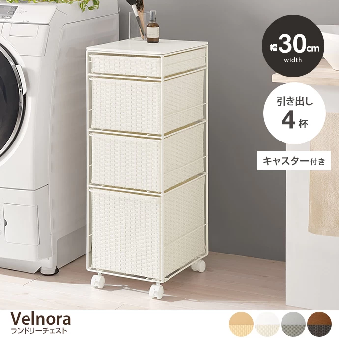 隙間にすっきり収まるスリムなランドリーチェスト。ラタン調に編み込まれた樹脂製の引き出しは、水や汚れに強くお手入れが簡単。通気性にも優れており、湿気の多い場所でも快適にお使いいただけます。また4杯の引き出しはそれぞれ高さが異なり、収納物に合わせて使い分けが可能です。さらにキャスター付きのため、移動や掃除もスムーズに。ランドリーだけでなくキッチンやリビング収納としても活躍します。